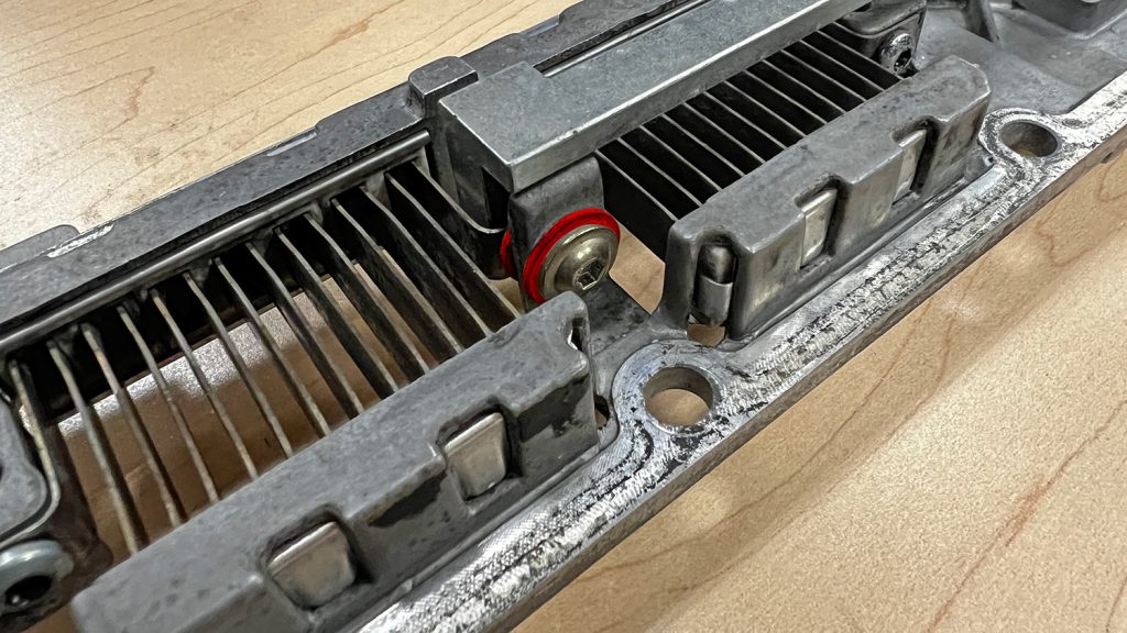 Looking at the photo below, you’ll notice two non-conductive washers separating it from the body of the heater assembly. The screw’s job is to keep the bus bar sandwiched against the heater element. 220+ amps travels directly from the bus bar to the heater grid. However, if this screw backs out by even a single thread, the screw will carry all 220+ amps from the bus bar to the heater. How does BD plan to keep this screw from backing out, arcing, melting, and falling into the intake manifold? Threadlocker.